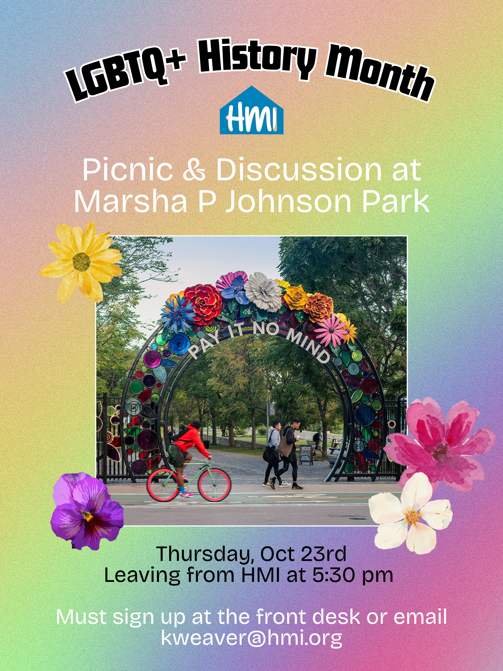 What's the T-Blocker: A group for trans femmes/trans women to gather and talk authentically about their experiences. Email Bre or Mykey for more info: boreilly@hmi.org & madme@hmi.org. Work through your thoughts and feelings with art at Art Blooms, no art experience necessary. In the Art Space. Email Sus at sspieler@hmi.org |