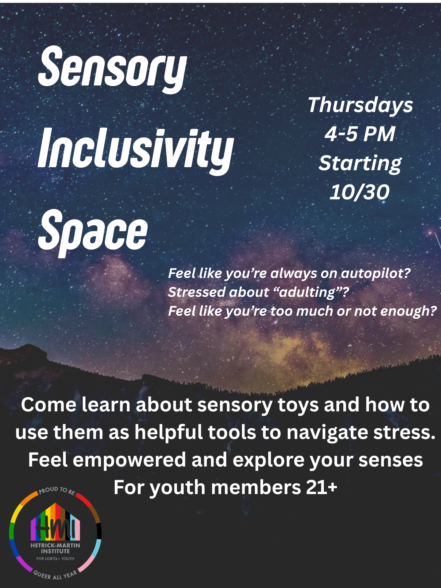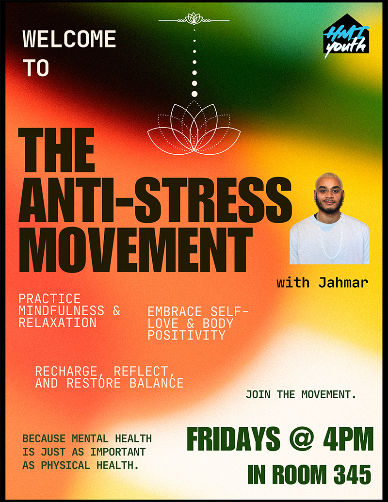 Your House (Sip hot tea, Sink into cozy vibes, chat quietly, or chill with a movie or series. No pressure —just a warm, welcoming place to relax and be yourself.), which will occur every Thursday from 4-5 PM. Email Spencer at solson@hmi.org.