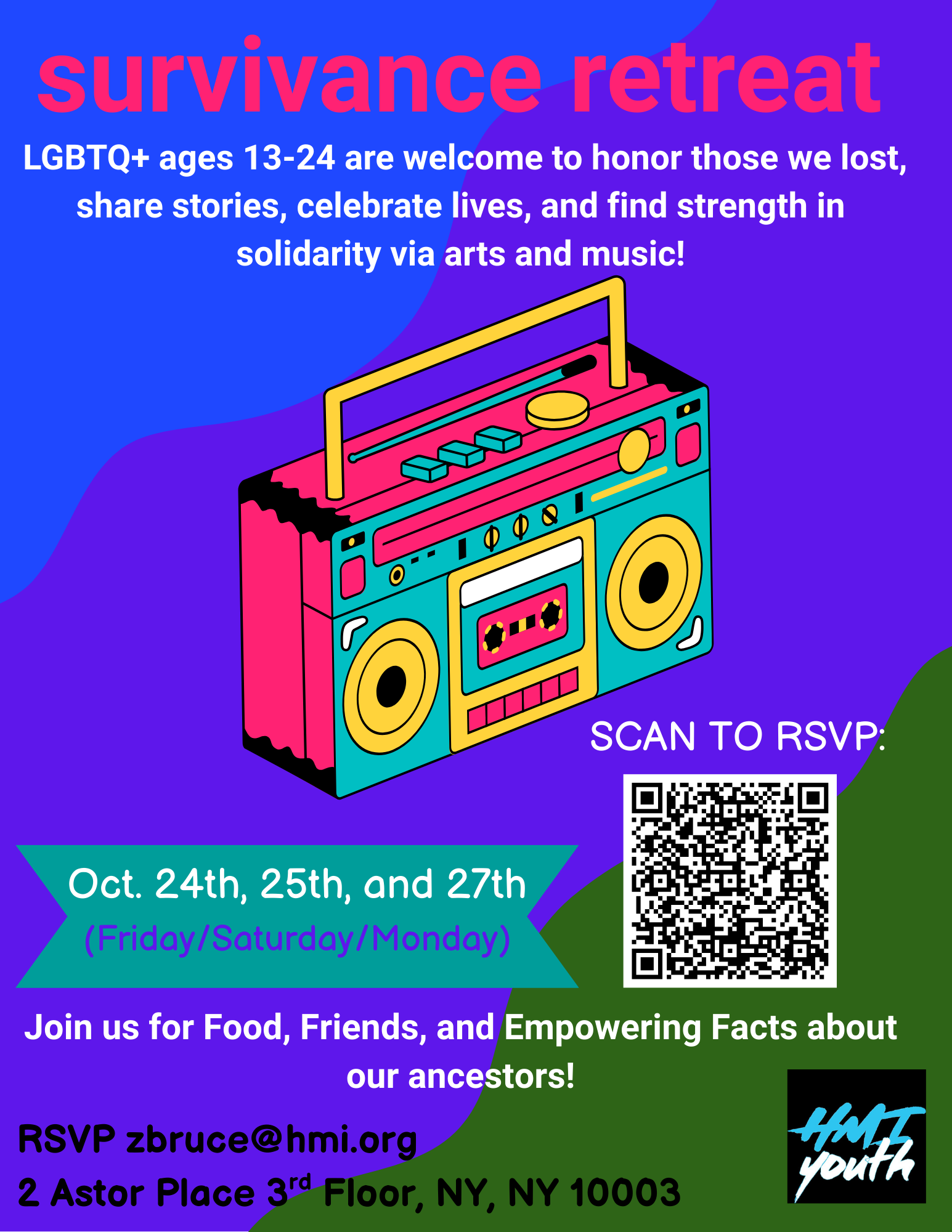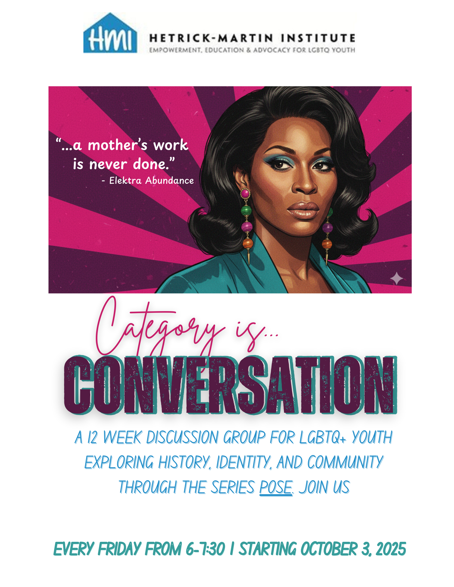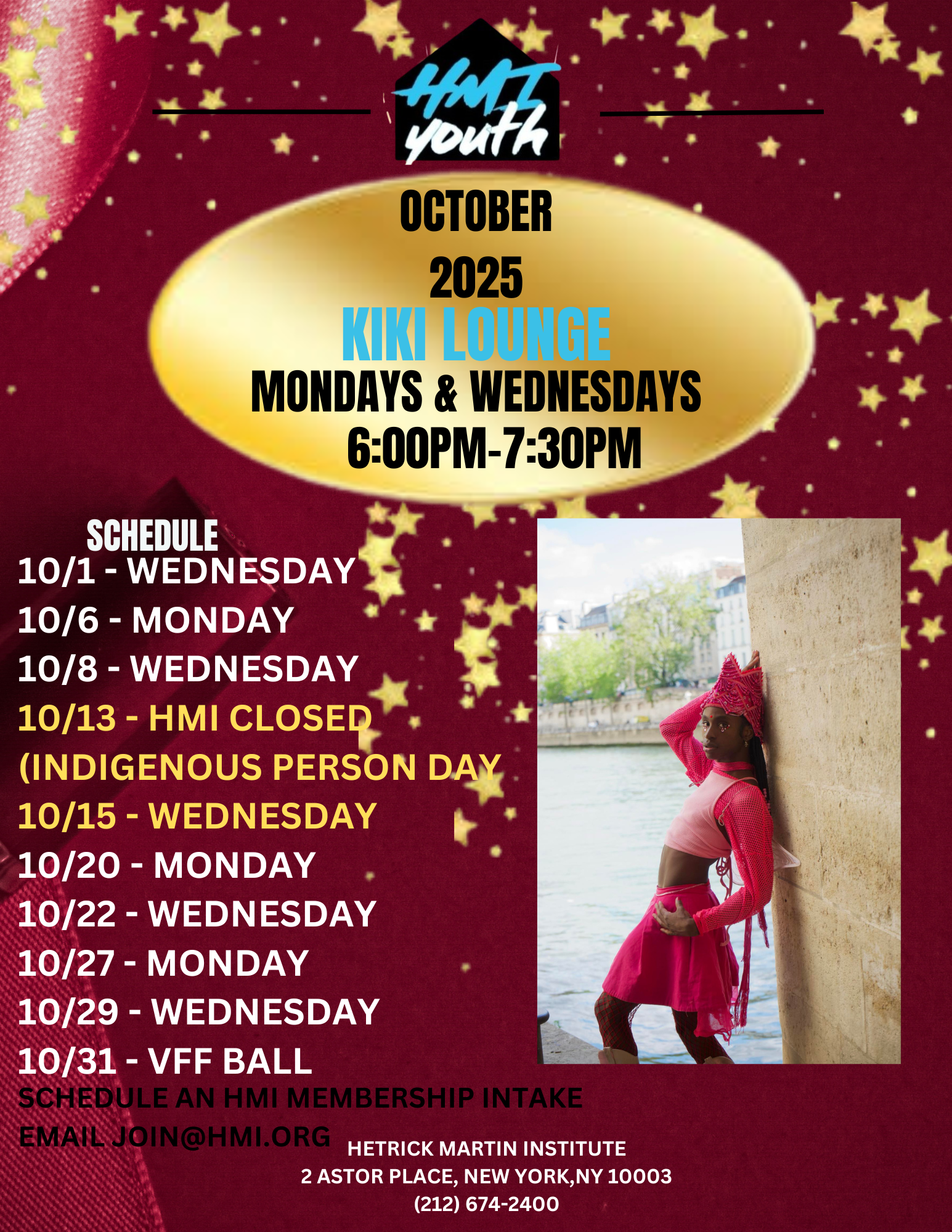 HMI Kiki Lounge (Mondays & Wednesdays, 6-7:30pm). Kiki, Vogue, runway. What’s your fancy? Come hang out with your friends and house members to practice your skills and get ready for the upcoming function. Email hmiyouth@hmi.org for more information.