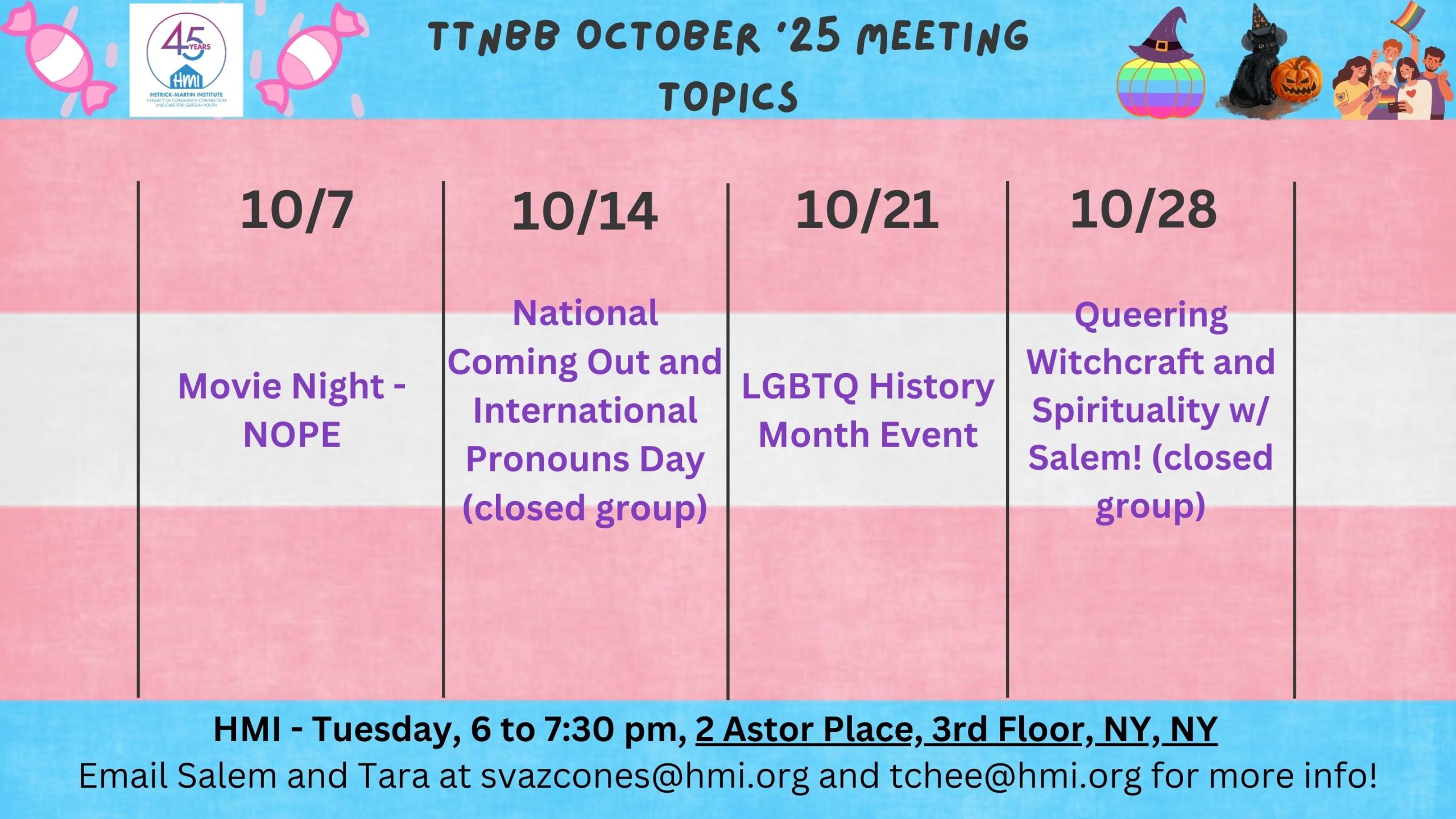 Join for Trans Treats and Non-Binary Bytes to talk about gender and how it intersects with all other parts of your identity! Treat yourself to snacks and a a community space for TGNB youth! Join HMI’s Salem and Tara every Tuesday from 6-7:30pm in room 301. As a courtesy to other attendees please arrive before 6:30pm. Email Salem at svazcones@hmi.org