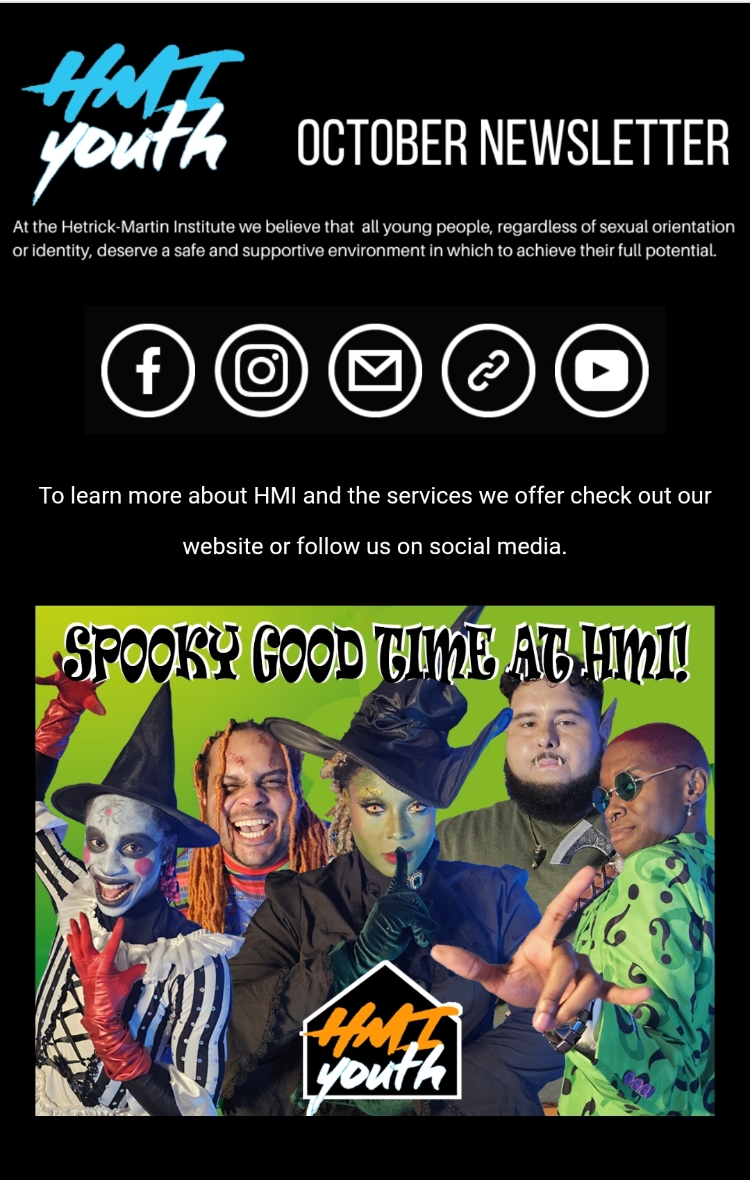 drama therapy-based group facilitated by Jahmar and Spencer every Wednesday from 4-5 PM. It’s called CTRL-ALT-QUEER: Flip the script—ditch old roles, try on new ones, and own your queer power through art, drama, and play. Email Jahmar at jortiz@hmi.org for more info.